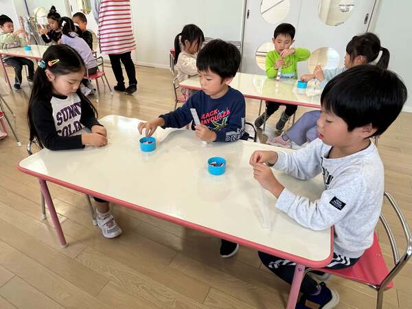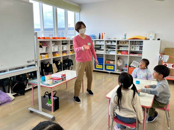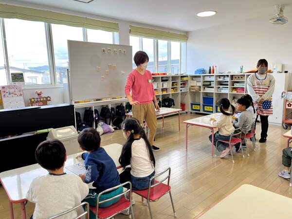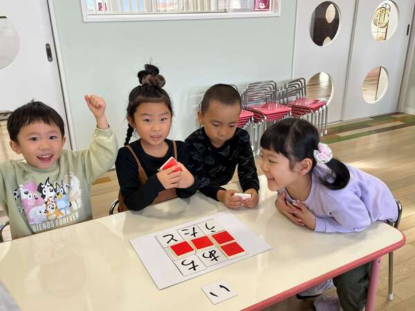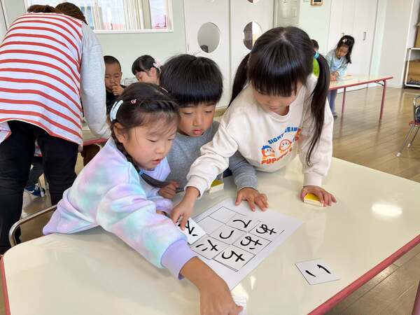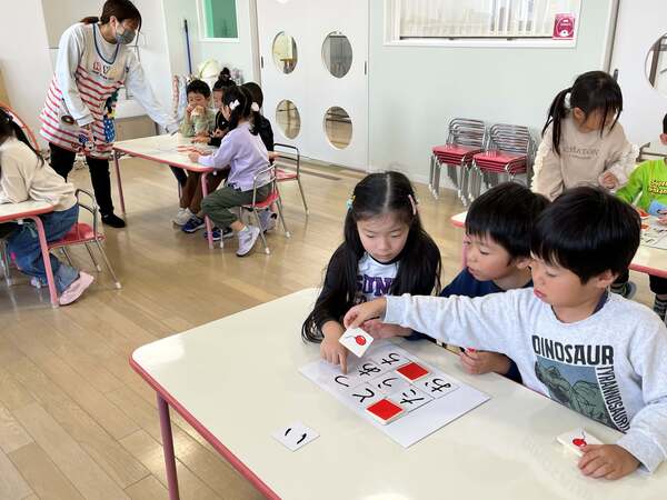 | 10月23日(木)、やま組(5歳児)さんがまなびタイムに参加しました。ゲーム感覚で文字や数を学び、こどもたちは楽しく活動していましたよ♪ | ||