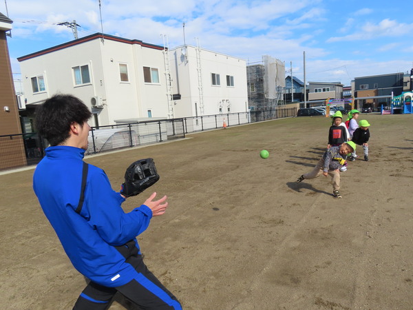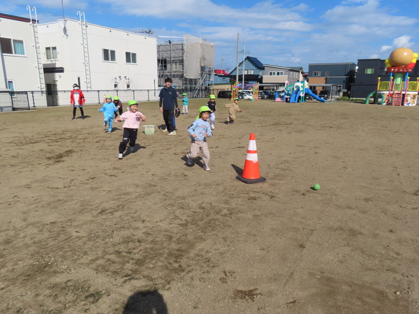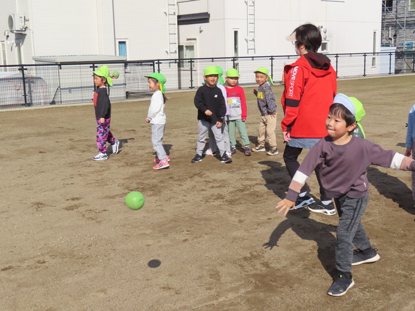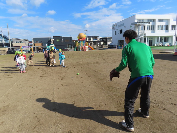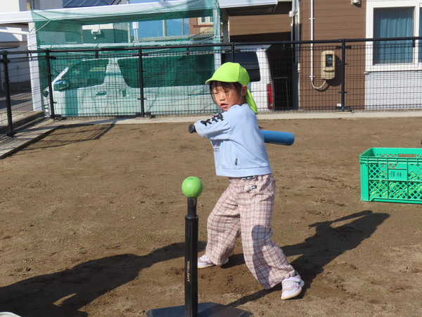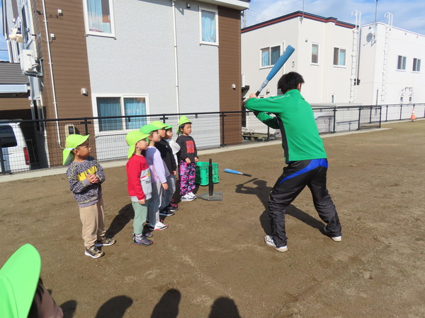 | やま組(5歳児)さんが体操教室に参加しました。今回は園庭で野球をしました。初めて野球をした子が多かったですが、みんなコツを覚え野球選手のように活動し、たのしんでいましたよ♪ | ||