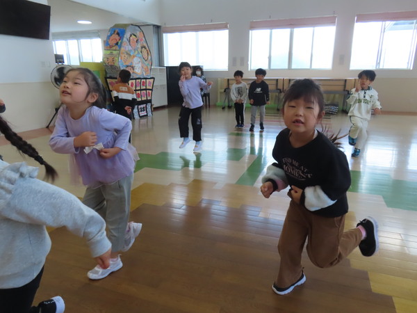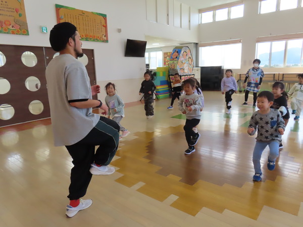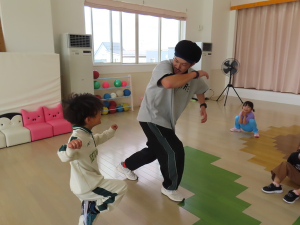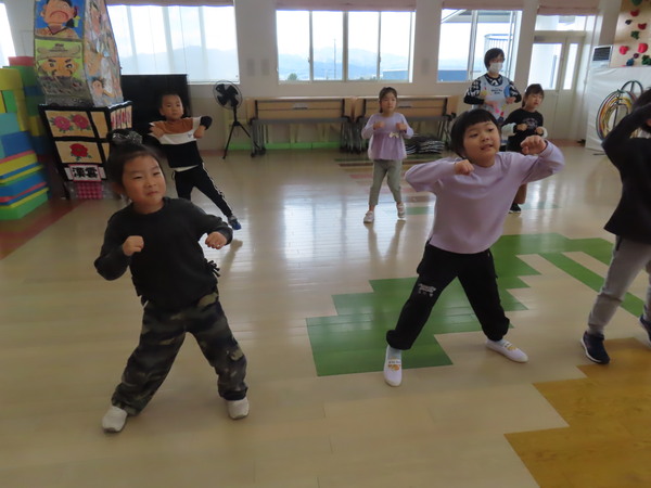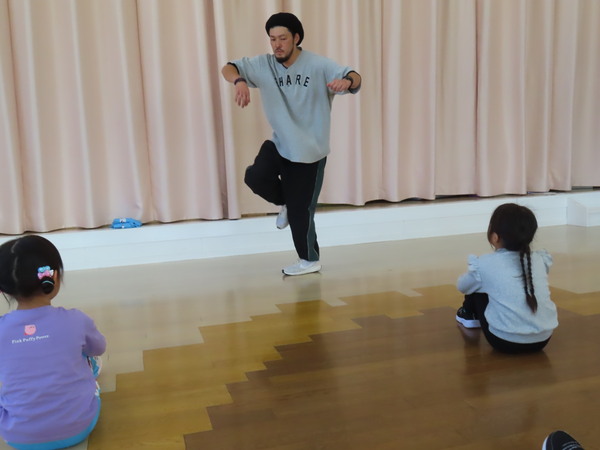 | やま組(5歳児)さんが、ダンス教室に参加しました。様々なステップを練習し、少し早いリズムの曲に合わせてダンスをしてみたりとダンサーになった気分で、活発に活動していました。ダンスの先生のキレキレのダンスに、「かっこいい!」「すご〜い☆」と目を輝かせていましたよ♪ | ||