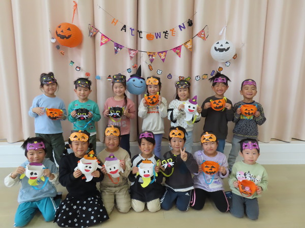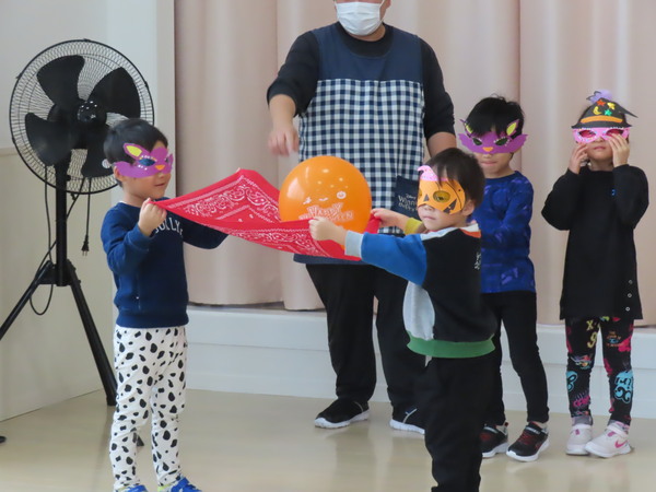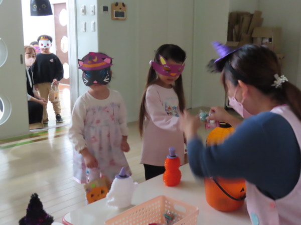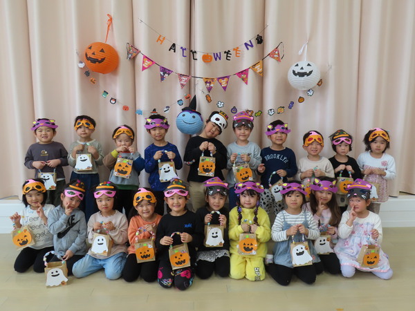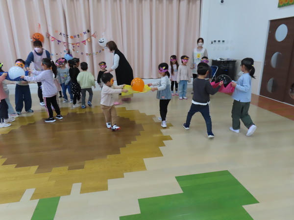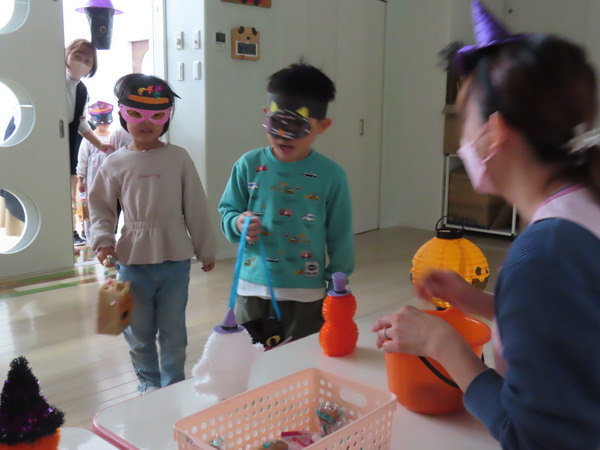 | やま・うみ組(4、5歳児)さんが、英会話教室の中でハロウィンパーティーに行いました。ハロウィンの由来を知り、友だちと一緒に仮装し風船リレーを楽しみました!リレーのゴールした順番に、お菓子をもらいに行きました。「トリックオアトリート!」と元気に言う子や、少し恥ずかしそうにしている子もいましたが、お菓子をもらうとみんな笑顔を見せていましたよ☆ | ||