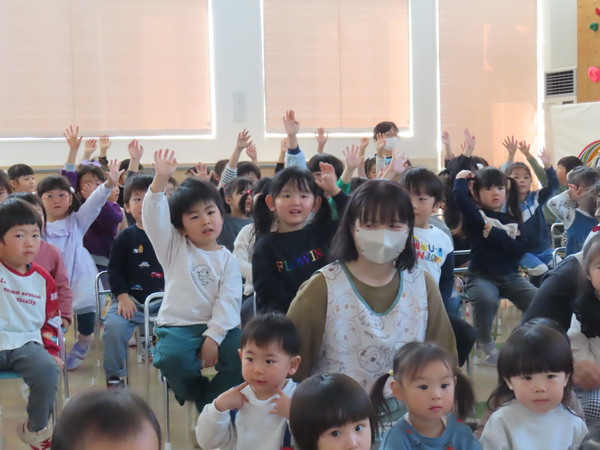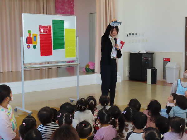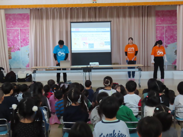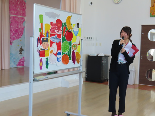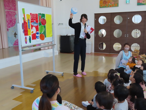 | いつもお給食でお世話になっている、ヤマイシさんが食育集会で出前授業をしてくれました。食品に含まれる栄養の働きを赤・黄・緑で分類した「3色食品群」についてお話してくれました。最後はクイズをし、こどもたちは積極的に答えていましたよ☆とてもわかりやすく、楽しく教えてくれました。こどもたちは、苦手な食べ物も少し頑張ってみようという気持ちになったようです♪ ヤマイシさん、ありがとうございました♪ |