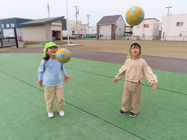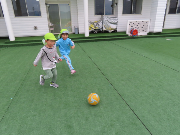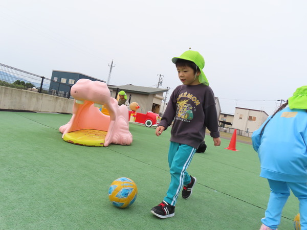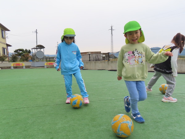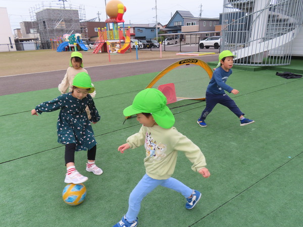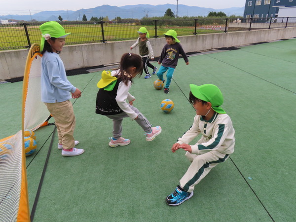 | やま組(5歳児)さんがサッカー教室に参加しました。ボールを追いかけ、夢中になりながらサッカーを楽しんでいましたよ♪ | ||
