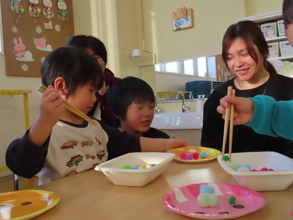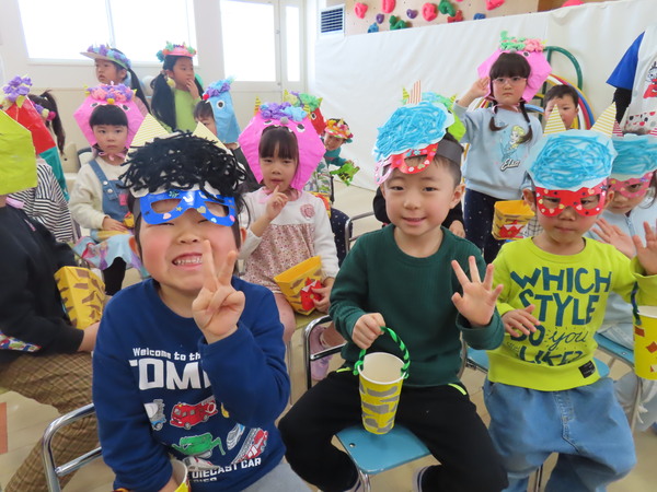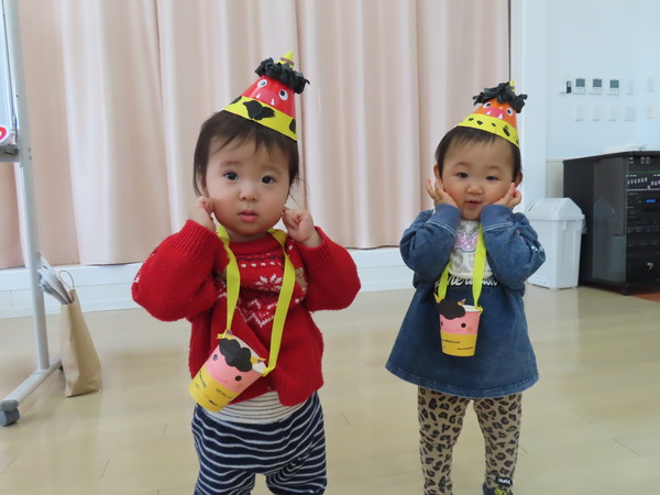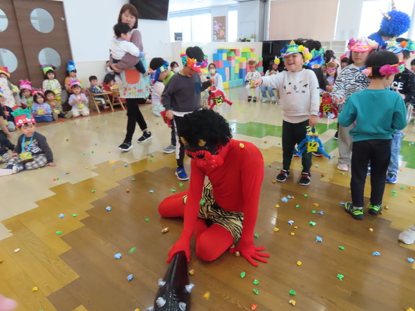 | 2月3日(火)、豆まき集会を行いました。節分の由来クイズをし、こどもたちは興味を持って答えていました。どんな鬼がいるか、みんなの心の中にもどんな鬼がいるか考え、豆まきをしましたよ♪鬼が登場すると、こどもたちは必死に自分の心の鬼を退治していました☆ | ||