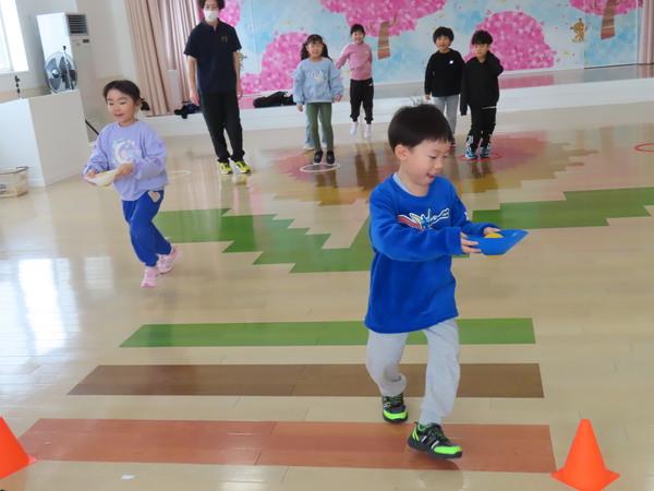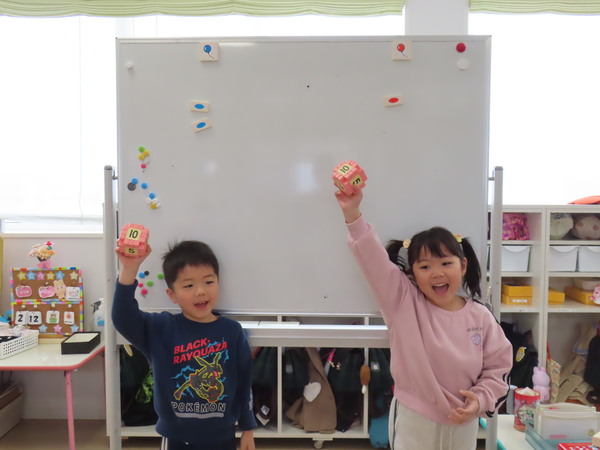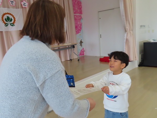 | やま組(5歳児)さんがまなびタイムに参加しました。さいころを転がし数の大きさを競い、笑顔で楽しく活動していました。また、濁点のつく言葉を学び、ワークシートに取り組みましたよ♪ うみ、やま組(4、5歳児)さんが英会話教室に参加しました。友だちと一緒に英語でのやり取りを楽しんでいました。 また、やま組(5歳児)さんは、先月受験したJAPEC(英検)の合格証書をもらいました。受験した子、全員が合格しました♡笑顔で証書をもらうこどもたちの表情がとても印象的でした☆ |