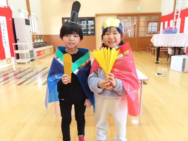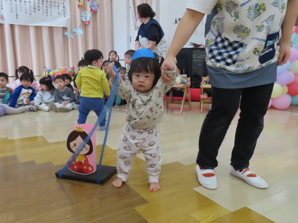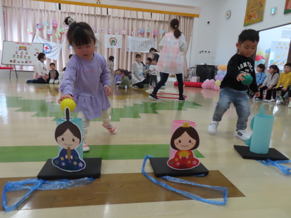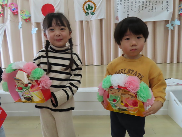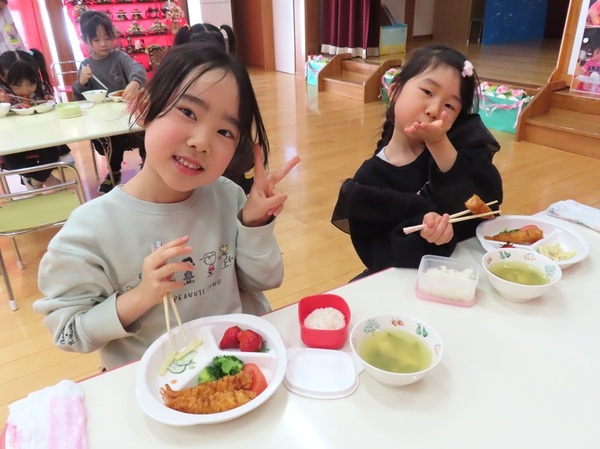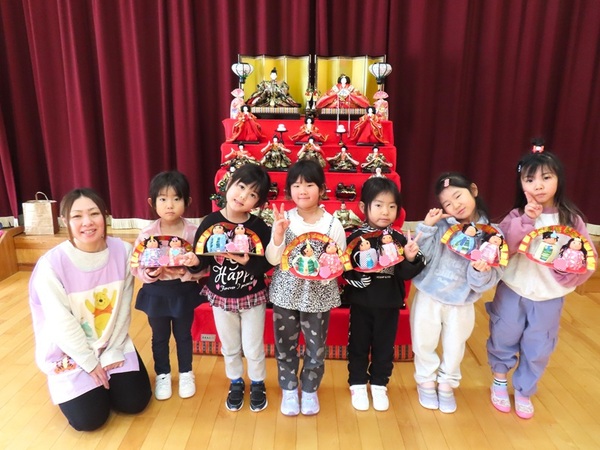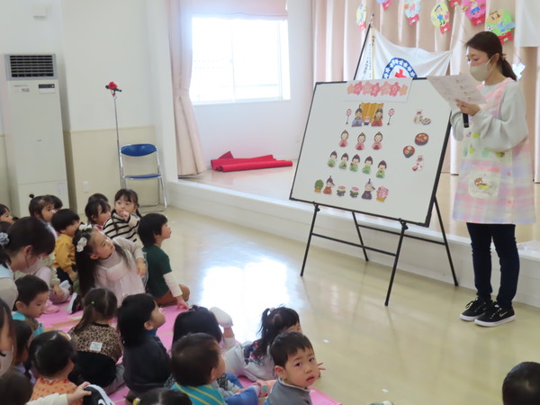 | 3月3日(火)、ひなまつり集会を行いました。ひなまつりの由来をパネルシアターを見ながら、楽しく知りました。みんなが作った作品を紹介し、ゲームをしました。ゲームは大盛り上がりで、笑顔溢れる楽しい時間を過ごしました。 そして、お給食ではちらし寿司を美味しく頂きましたよ♪ |