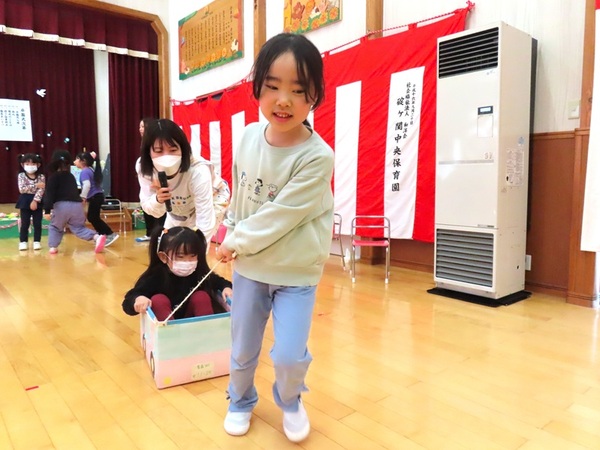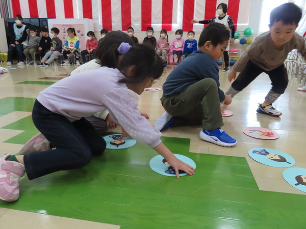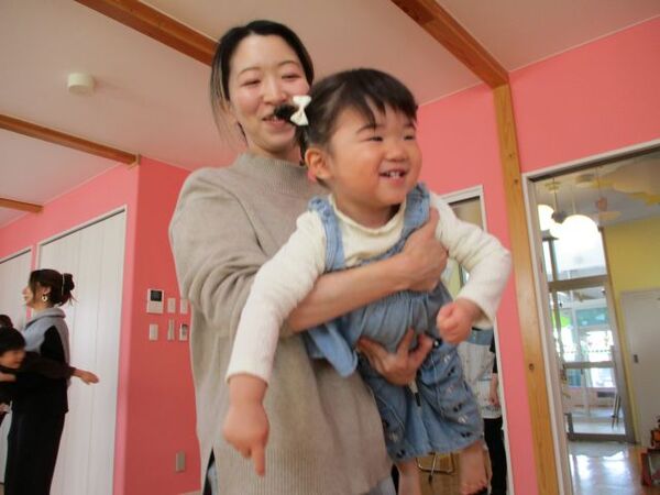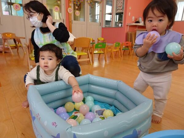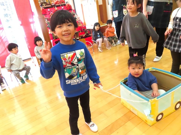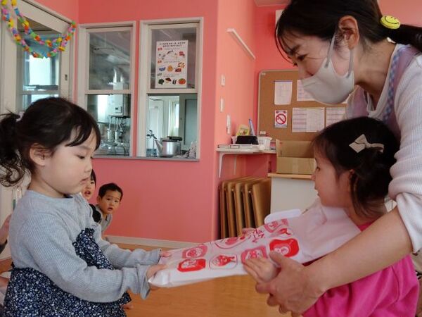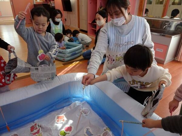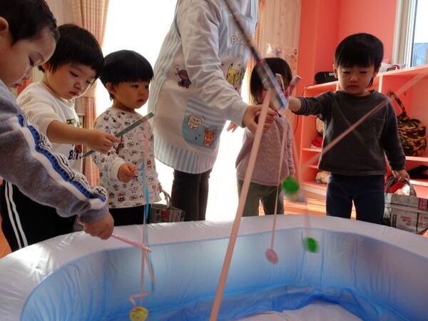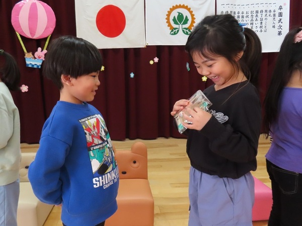 | 転園するお友だちとのお別れ会が行われました。魚釣りや宝さがしを一緒に楽しみました。 プレゼントを渡し、「遊んでくれてありがとう」と感謝の気持ちを伝え、ありがとうでいっぱいの会になりました。 新しい保育園に行っても、ずっと応援しています。 |