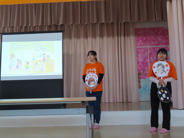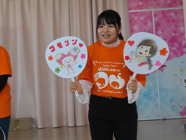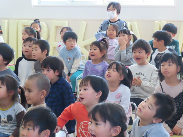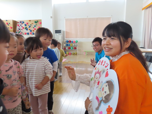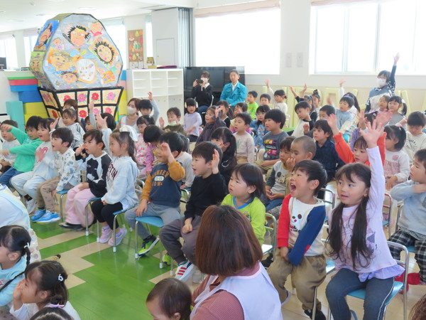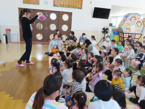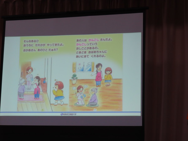| 青森県保健大学の生徒さんが、絵本の読み聞かせをしてくれました。プロジェクターを使い、絵本を映像で流してくれました。初めて見るこどもたちは真剣な表情でみていましたよ♪読み聞かせ終了後は、お兄さん、お姉さんとふれ合い楽しい時間を過ごしました☆ 青森保健大学の生徒さん、ありがとうございました♡ |