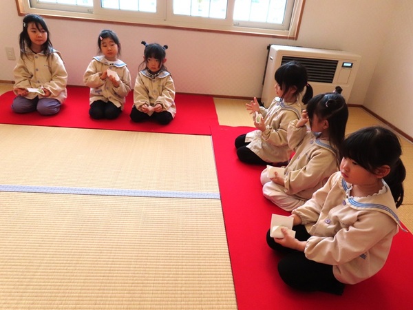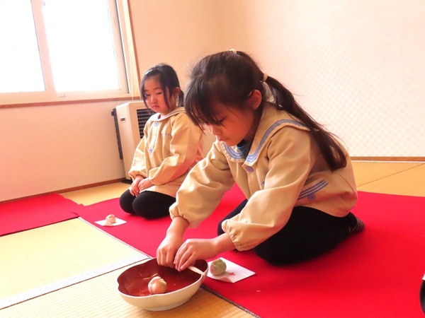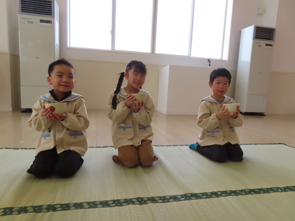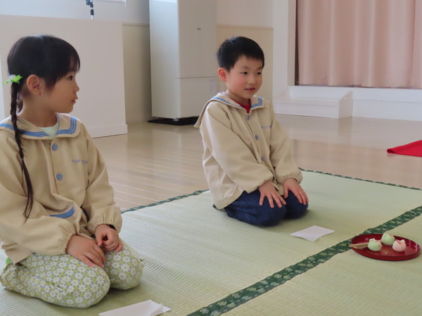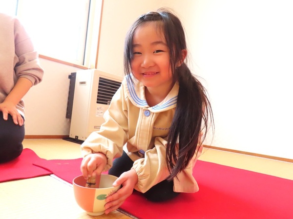 | 3月13日(金)、卒園お祝い茶会にやま組(5歳児)さんが参加しました。いつもとは少し違う落ち着いた雰囲気の中で、お茶の作法を学び、一つひとつ丁寧に取り組む姿が印象的でした。美味しい抹茶と和菓子を頂き、卒園をお祝いしましたよ♪ | ||