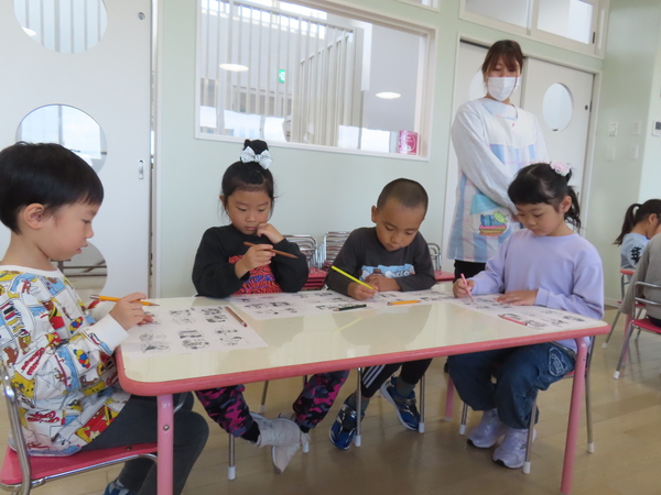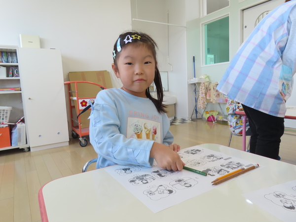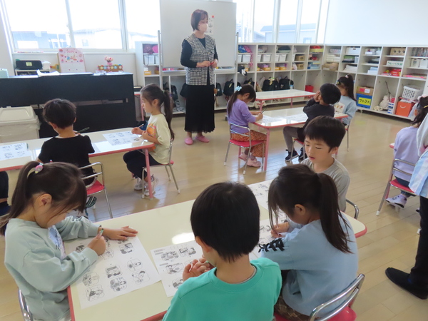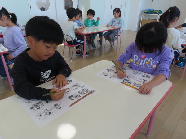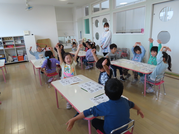 | 10月14日(火)、やま組(5歳児)さんが英検勉強を行いました。夏から取り組んでいる英検勉強!リスニングにも少しずつ慣れ、今回も真剣な表情で取り組んでいたこどもたちです。 | ||
