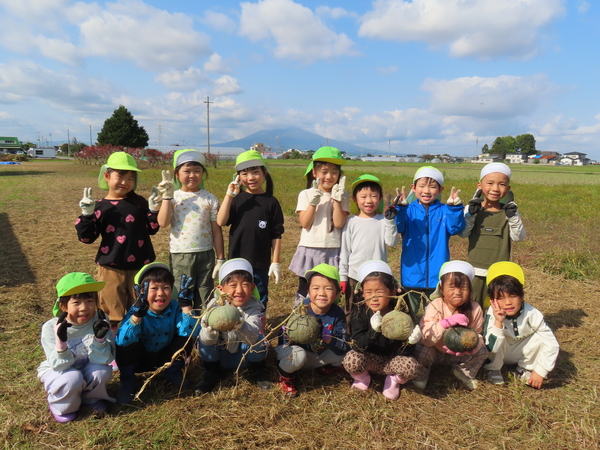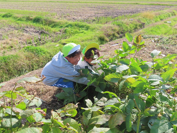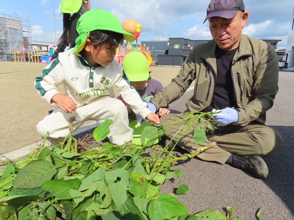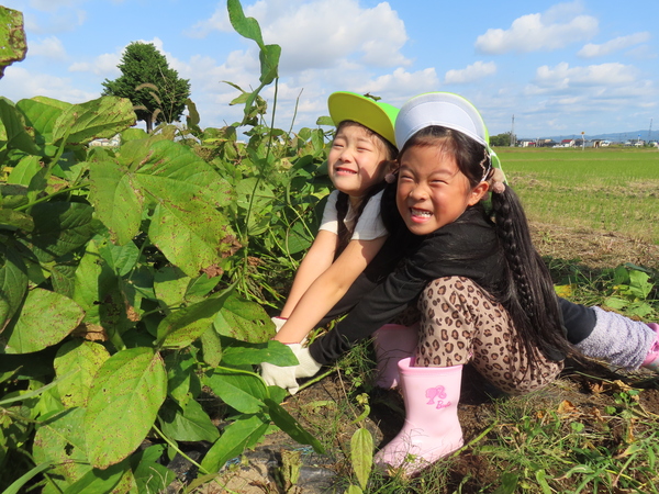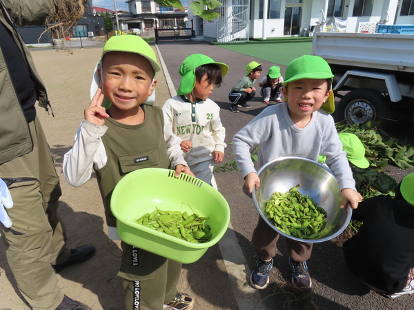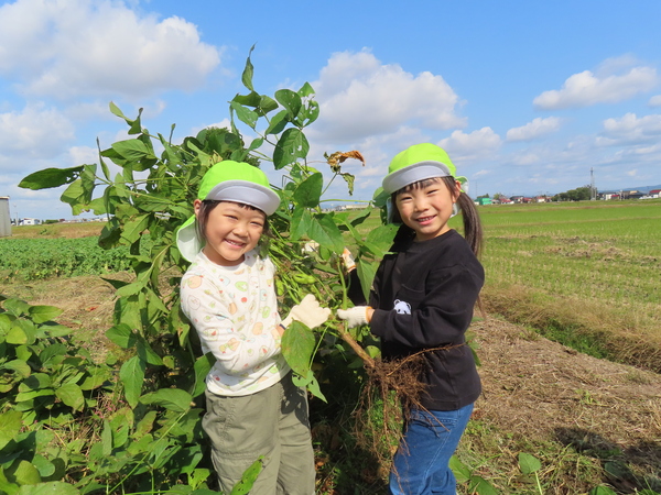 | 10月15日(水)、やま組(5歳児)さんがラビット農園に枝豆の収穫に行ってきました。天気も良く、戸外の心地よさを感じながら、友だちと一緒に力を合わせ、「うんとこしょ!どっこいしょ!」と枝豆を引っぱり収穫していましたよ♪ | ||