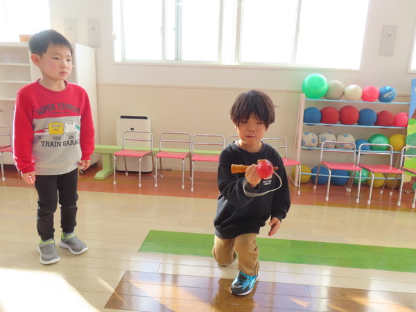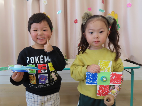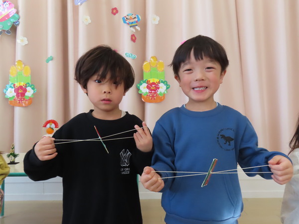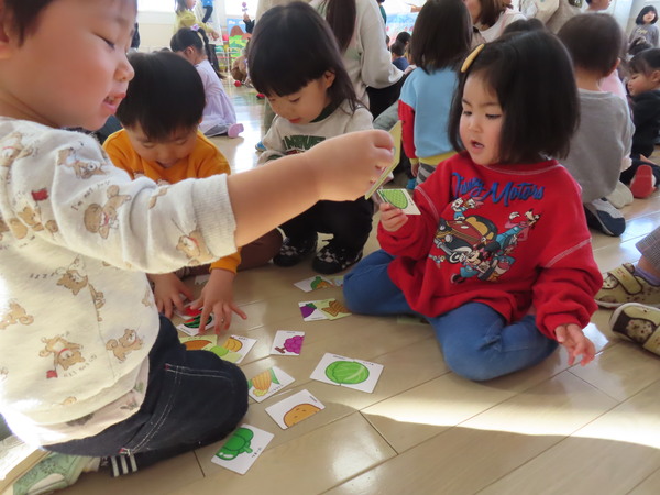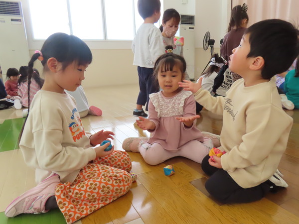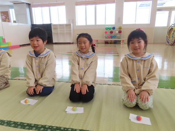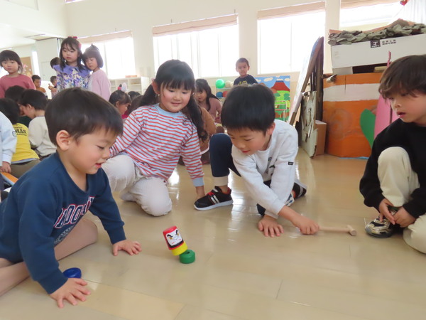 | 1月7日(水)、新年お楽しみ会を行いました。ペープサートを見ながらお正月の由来を知り、伝承あそびを楽しみました。また、各クラスで製作した伝承あそびの紹介もしましたよ♪伝承あそびをコーナーごとに分け、友だちと一緒に様々なあそびを体験していましたよ☆異年齢児交流も楽しみながら、笑顔で楽しい時間を過ごしました♪ | ||