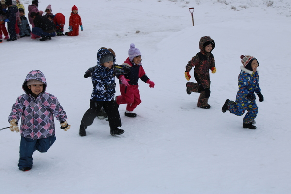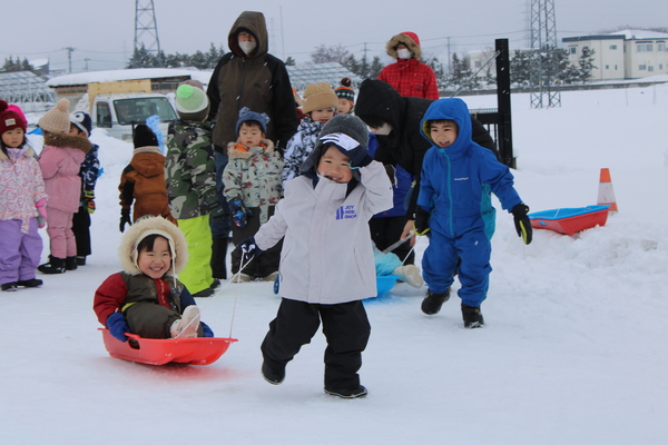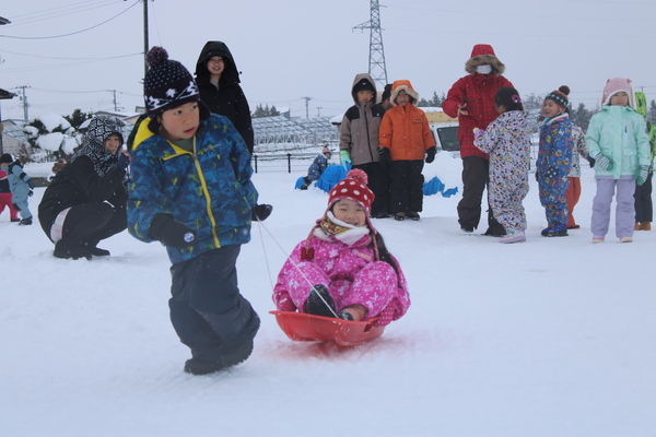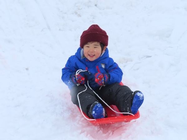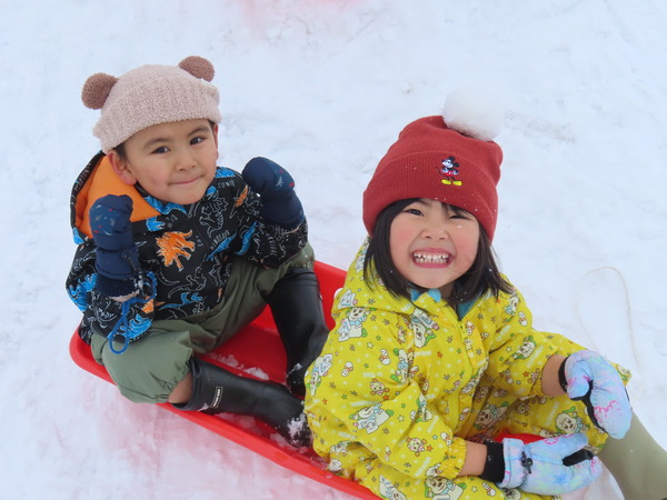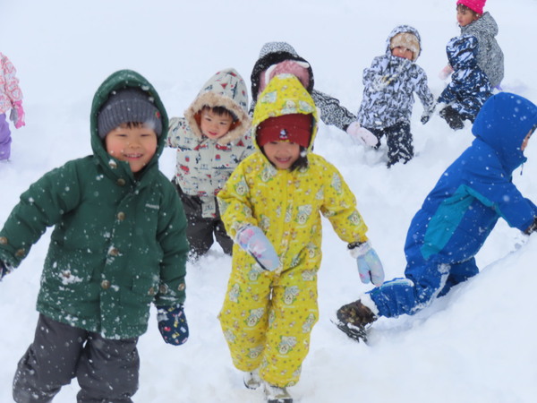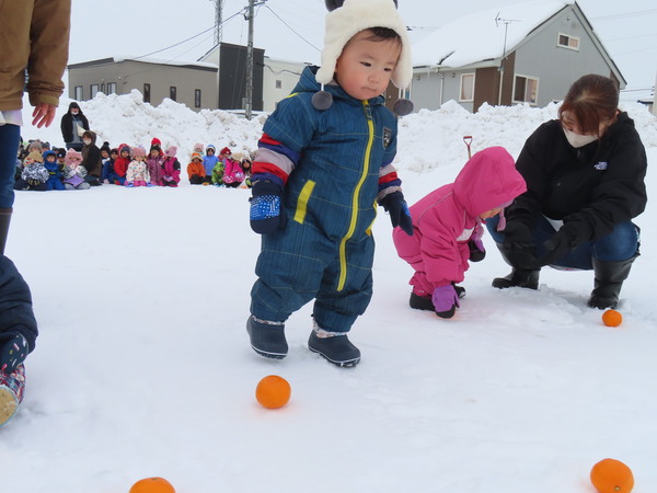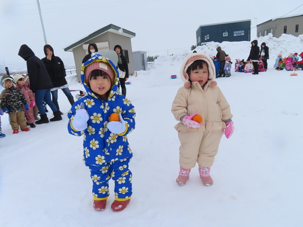 | 1月16日(金)、園庭で雪とあそぼう会を行いました。みかん拾いやそりリレーをし、雪上で活発に活動しましたよ。未満児のこどもたちが、一生懸命みかんを拾おうとする姿がとてもかわいかったです♡以上児のこどもたちは雪山を駆け登りみかんをGet!満面の笑みを浮かべていましたよ♪そりリレーも白熱し、みんなで楽しい時間を過ごしました。 | ||