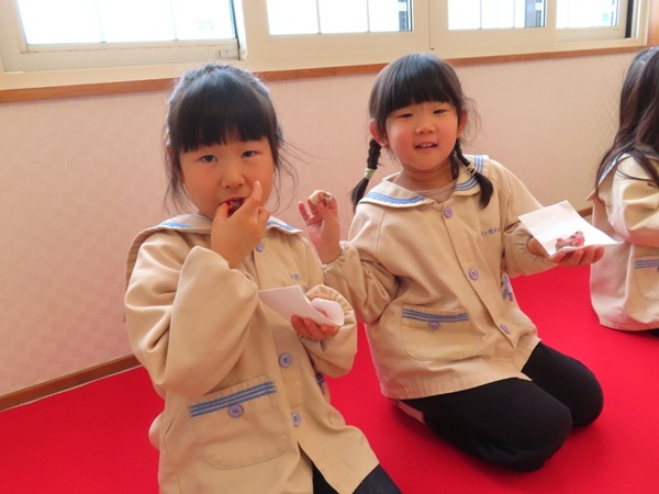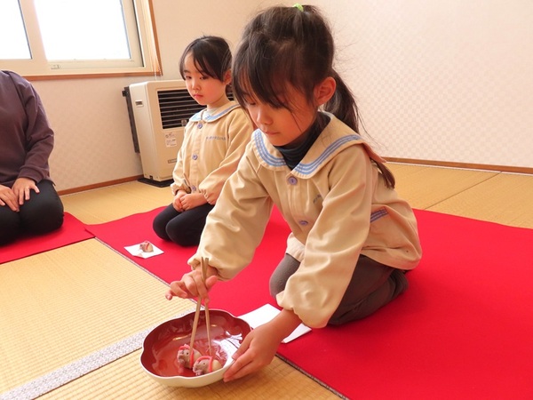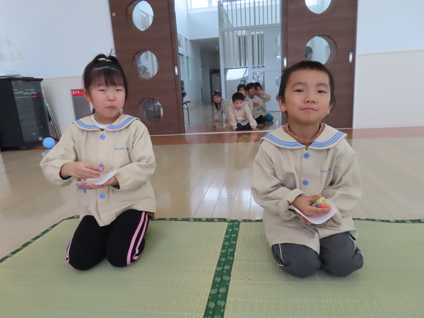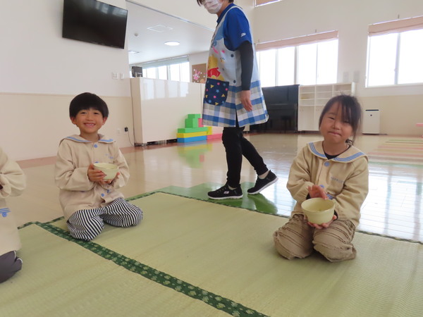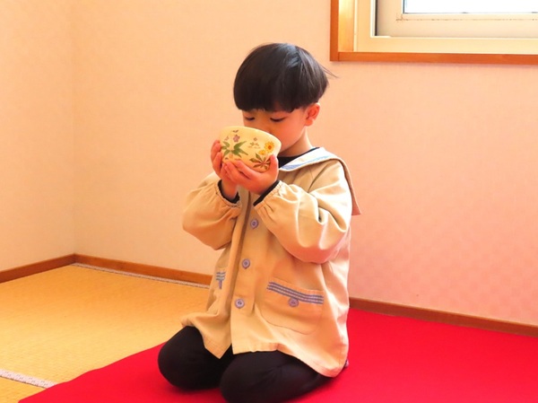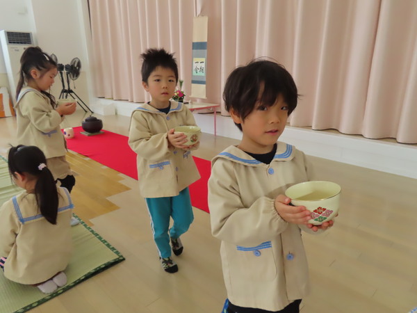 | 1月9日(金)、やま組(5歳児)さんが、新年お正月茶会に参加しました。お正月のお話を聞き、お茶の作法を学びました。いつもとは違う雰囲気の中で、抹茶と和菓子を頂きました♪ | ||