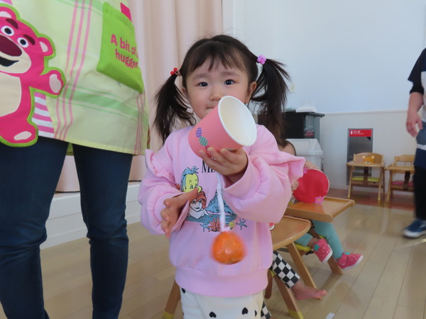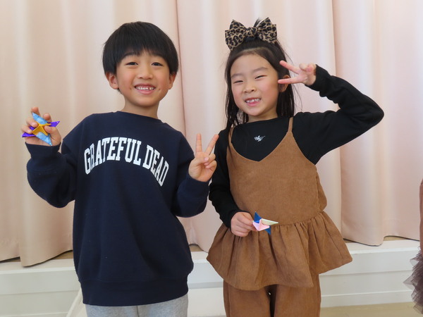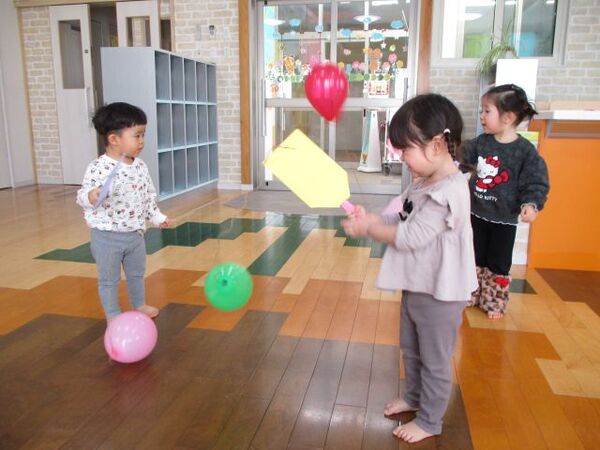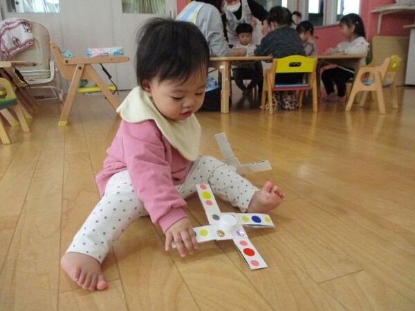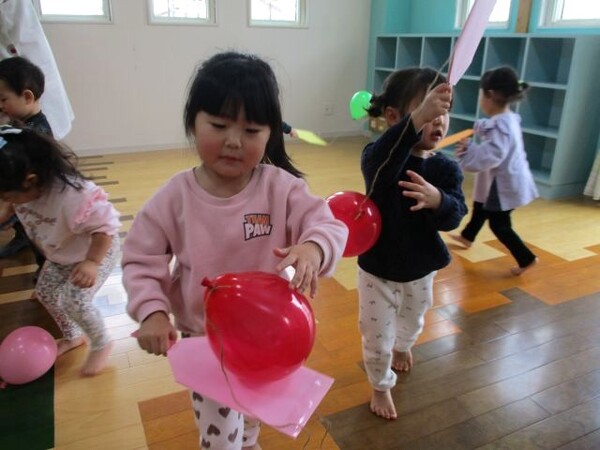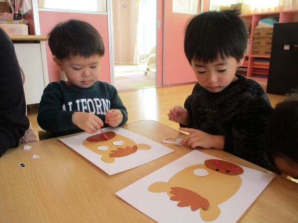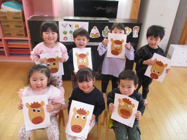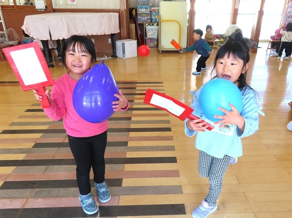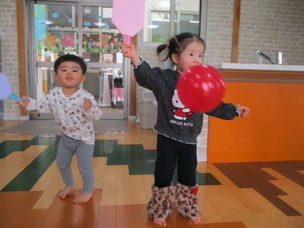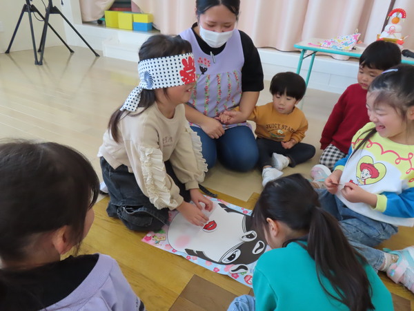| 新しい年になったことをお祝いして、新年おたのしみ会が行われました。 福笑い、羽子板、こま回しなど、正月あそびをみんなで楽しみました。 お正月のワクワクした雰囲気を感じながら楽しんでいました。 |