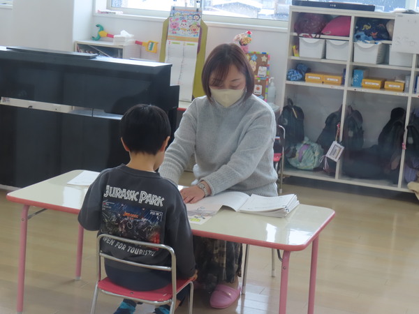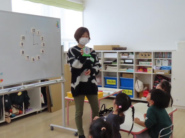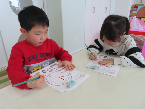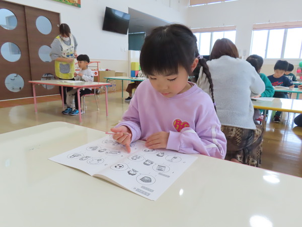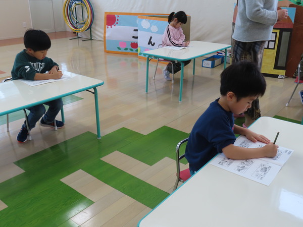 | やま組(5歳児)さんが、英検受験に挑戦しました。いつもとは違う雰囲気の中での英検!真剣な表情で取り組んでいましたよ。 まなびタイムでは、濁点のつく言葉と時計のお勉強もしましたよ。小学校へ向け、意欲的に取り組んでいました☆ |