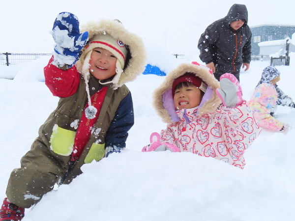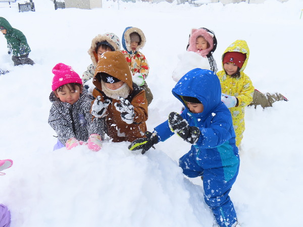 | そら組(3歳児)さんが、雪あそびを楽しみました♪園庭にたくさん積もった雪!こどもたちは大喜び!笑顔がたくさん見られる楽しい時間を満喫しました☆ | ||