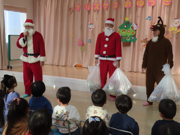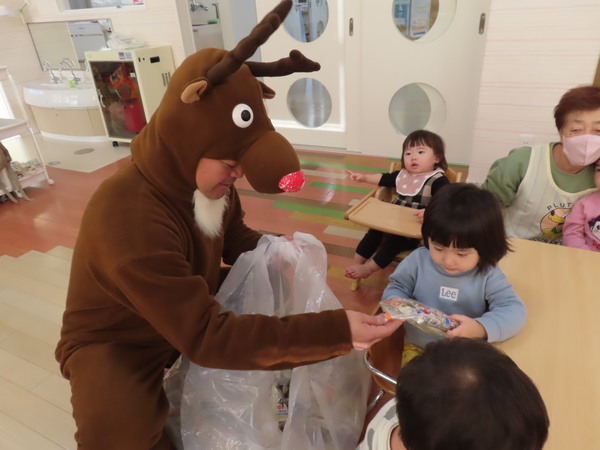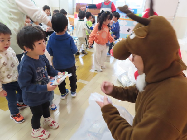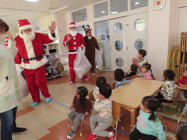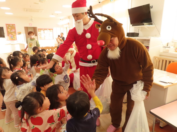 | 12月19日(金)、クリスマス訪問で商工会青年部の方が、サンタさんとトナカイさんになりあそびに来てくれました♪サンタさんたちの登場に大はしゃぎ!プレゼントをもらい、笑顔を見せて喜んでいましたよ☆ | ||