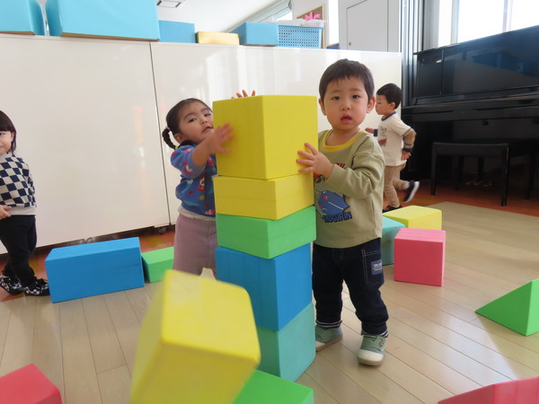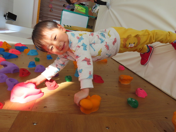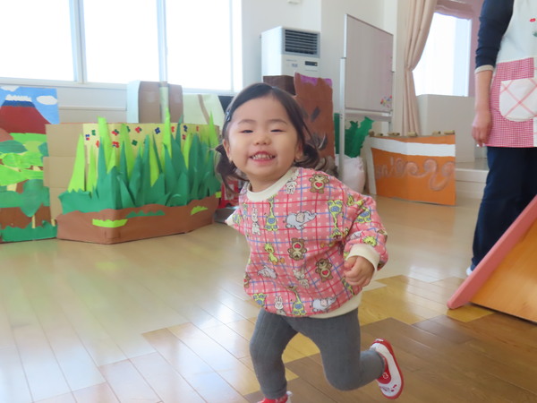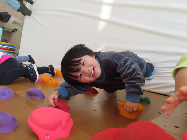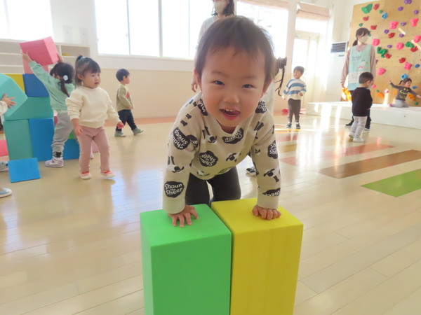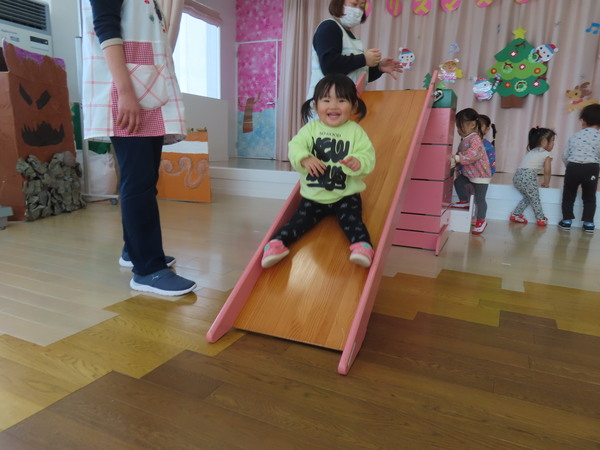 | ほし組(1歳児)のこどもたちが大好きな遊戯室!すべり台やクライミング、積み木で友だちと一緒に活発に活動し、楽しく体を動かし笑顔を見せていましたよ♪ | ||