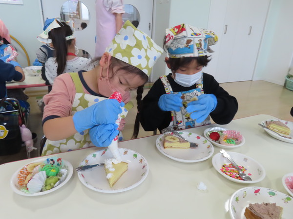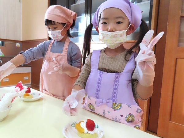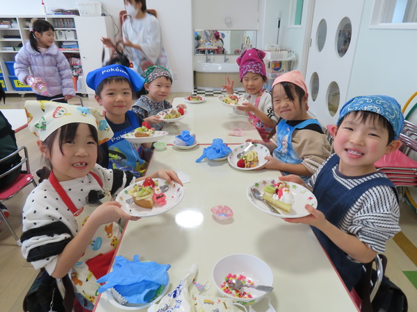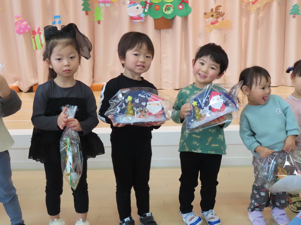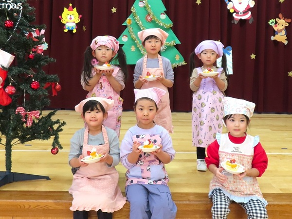 | 12月24日(水)、午前はクリスマス会、午後はやま組(5歳児)さんがクッキングでクリスマスケーキを作りました。 クリスマス会では、クリスマスの由来を知り、シアターを楽しみました。そして、サンタさんクイズをしていると・・・サンタさん登場! こどもたちは大喜び☆さんたさんに欲しい物をおねだりしていた子もいましたよ♡ 午後はやま組(5歳児)さんがクッキングでクリスマスケーキを作りました。こどもたちは悩みながらデコレーションをし、それぞれかわいい、素敵なケーキが出来上がりました☆みんな、「ママにも見せたいな〜」と話しながら、美味しく頂いていましたよ♪ |