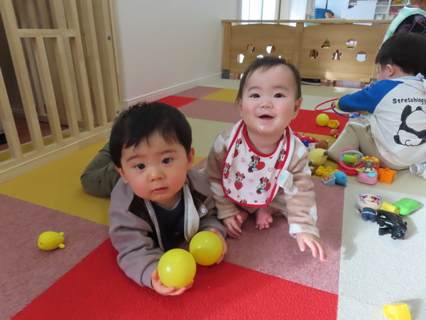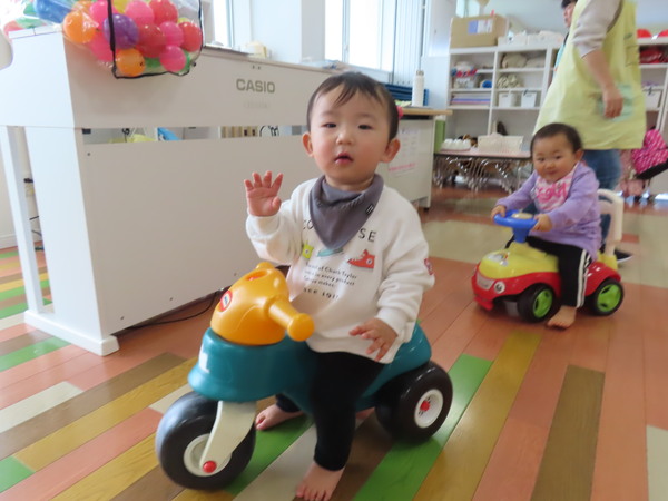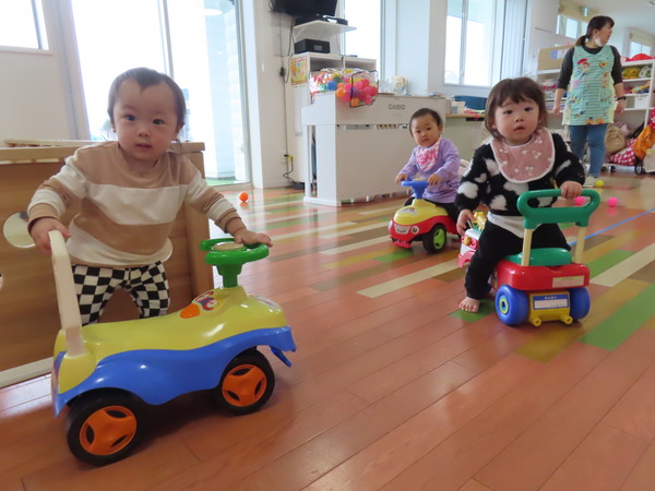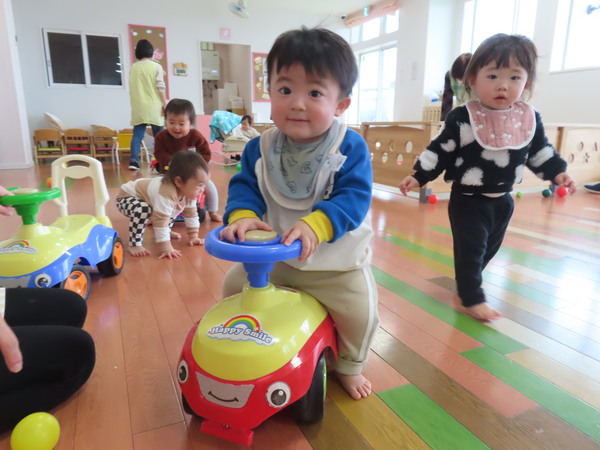 | かわいいほし組(0歳児)のこどもたち♡毎日かわいい笑顔であそんでいます♪車に乗るのも上手になりましたよ☆ | ||