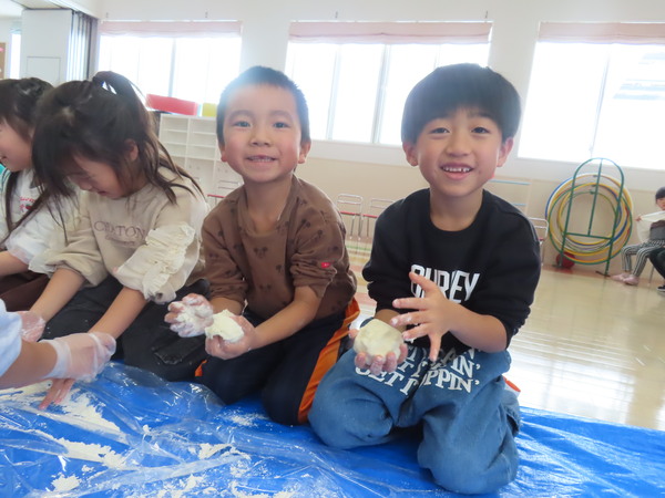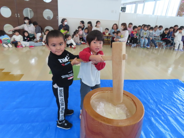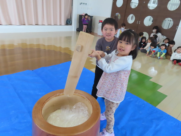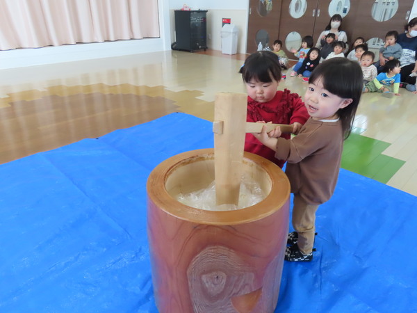 | 12月26日(金)、もちつき会を行いました。日本の伝統行事であるもちつきの由来を知り、もちつきの雰囲気を味わいました。「そ〜れ!よいしょ〜」のかけ声に合わせ、こどもたちは友だちと協力しもちつきを楽しみました♪年長さんは、もちを丸めて、お団子を作りましたよ☆ | ||