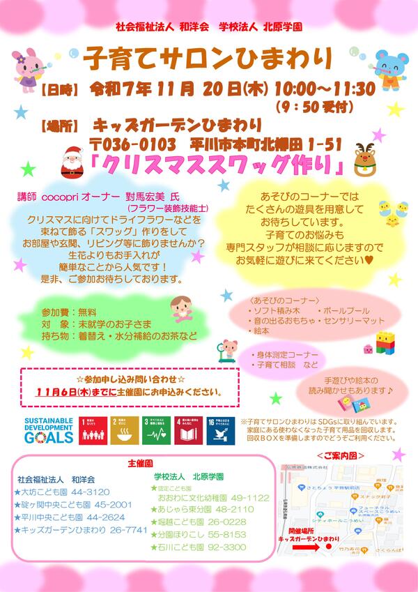 | 子育てサロンひまわりでは『クリスマス スワッグ作り』を開催します。 日時 令和7年11月20日(木) 10:00〜11:30 (9:50受付け) 場所 キッズガーデンひまわり クリスマスに向けてドライフラワーなどを束ねて飾る 「スワッグ」作りをして、お部屋や玄関、リビング等に飾りませんか? たくさんの参加をお待ちしています。 |